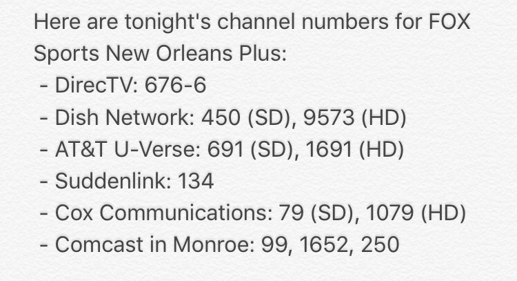 DISH Network Channel 140HD ATT U-Verse Channel 602HD Fox Sports New Orleans Cox Channel 38SD 1038HD DirecTV Channel 676-4HD ATT U-Verse Channel 758SD. Directv does have an agreement with Fox Sports New Orleans. Fox Sports is on channel 1 in the New Orleans area.